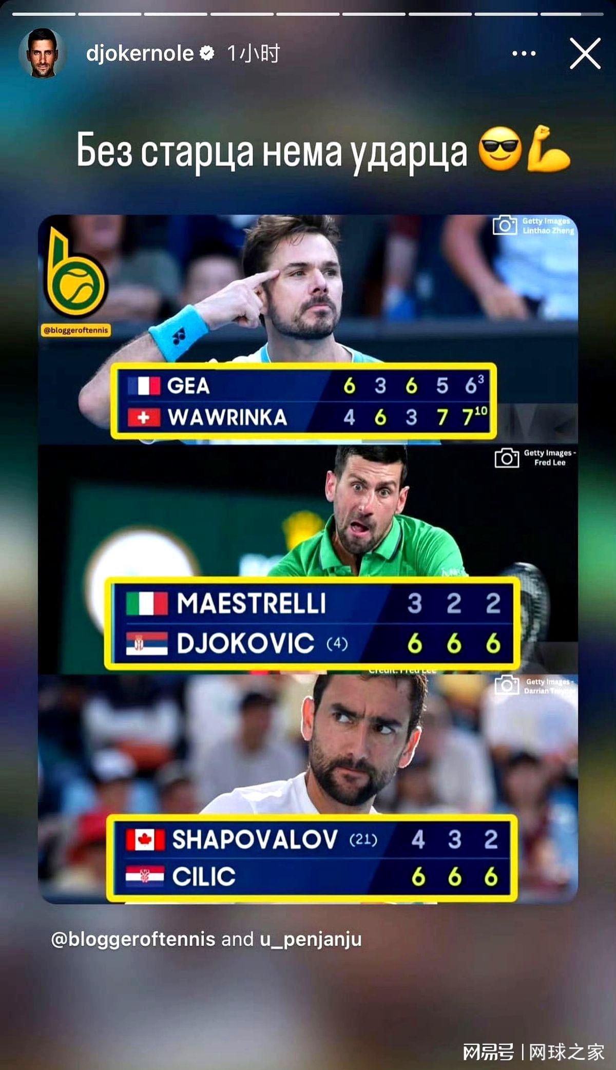 由瓦林卡、西里奇和德约组成的澳网不老男神团最终还是解体了,看到最后仅剩的德约接下来也将面对穆塞蒂的强有力挑战时,更让人觉得老将们在网坛打拼有多么不容易了。