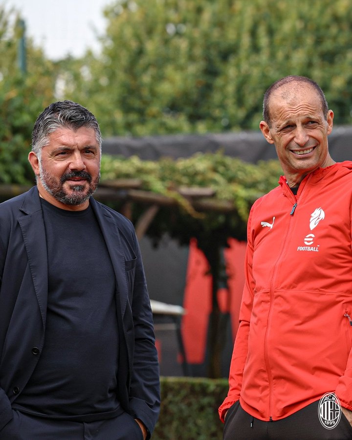 米兰官方社媒晒出加图索与阿莱格里的合照,以及布冯与迈尼昂的合照,配文:“欢迎加图索和他的教练团队造访米兰内洛。”